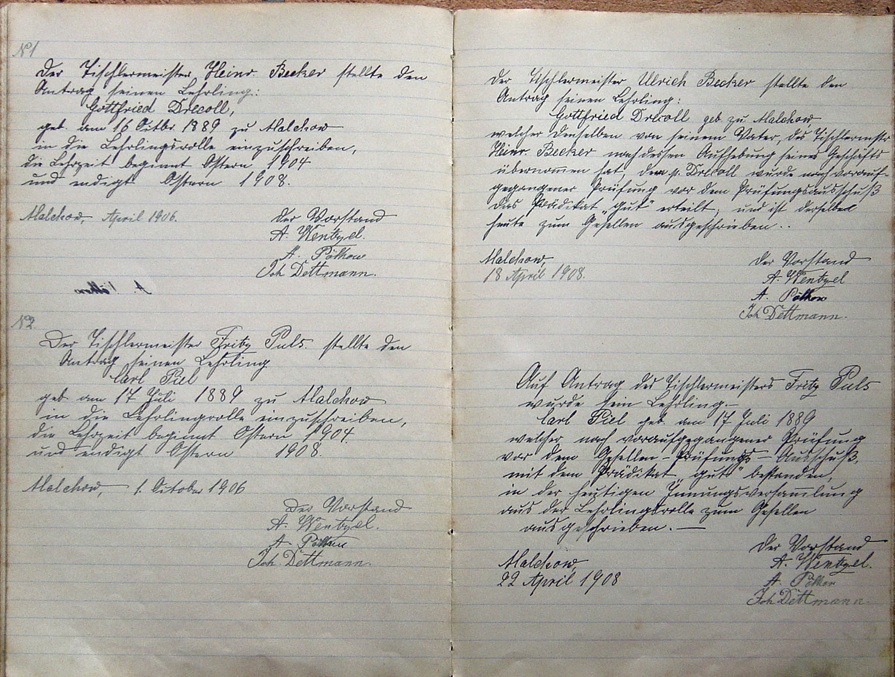 Der Tischlermeister Heinr. Becker stellte den Antrag seinen Lehrling: Gottfried Drecoll, geb. am 16. Octbr. 1889 zu Malchow in die Lehrlingsrolle einzuschreiben, Die Lehrzeit beginnt Ostern 1904 und endigt Ostern 1908. Malchow, April 1906 Der Vorstand |