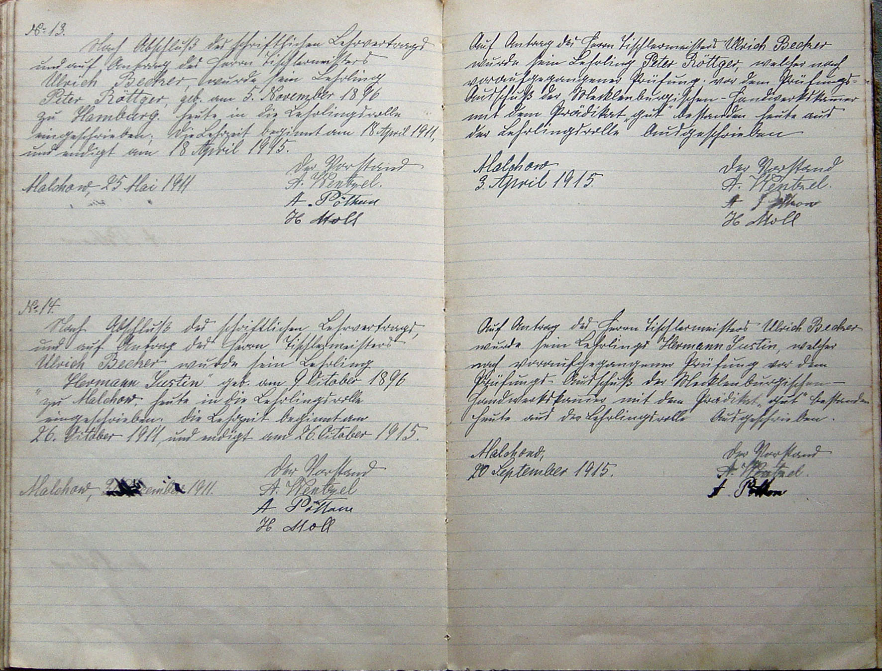 Nach Abschluß des schriftlichen Lehrvertrags und auf Antrag des Herrn Tischlermeisters Ulrich Becker, wurde sein Lehrling Peter Röttger, geb. am 5. November 1896 zu Hamburg heute in die Lehrlingsrolle eingeschrieben; Die Lehrzeit beginnt am 18. April 1911, und endigt am 18 April 1915. Malchow, 25 Mai 1911 Der Vorstand |