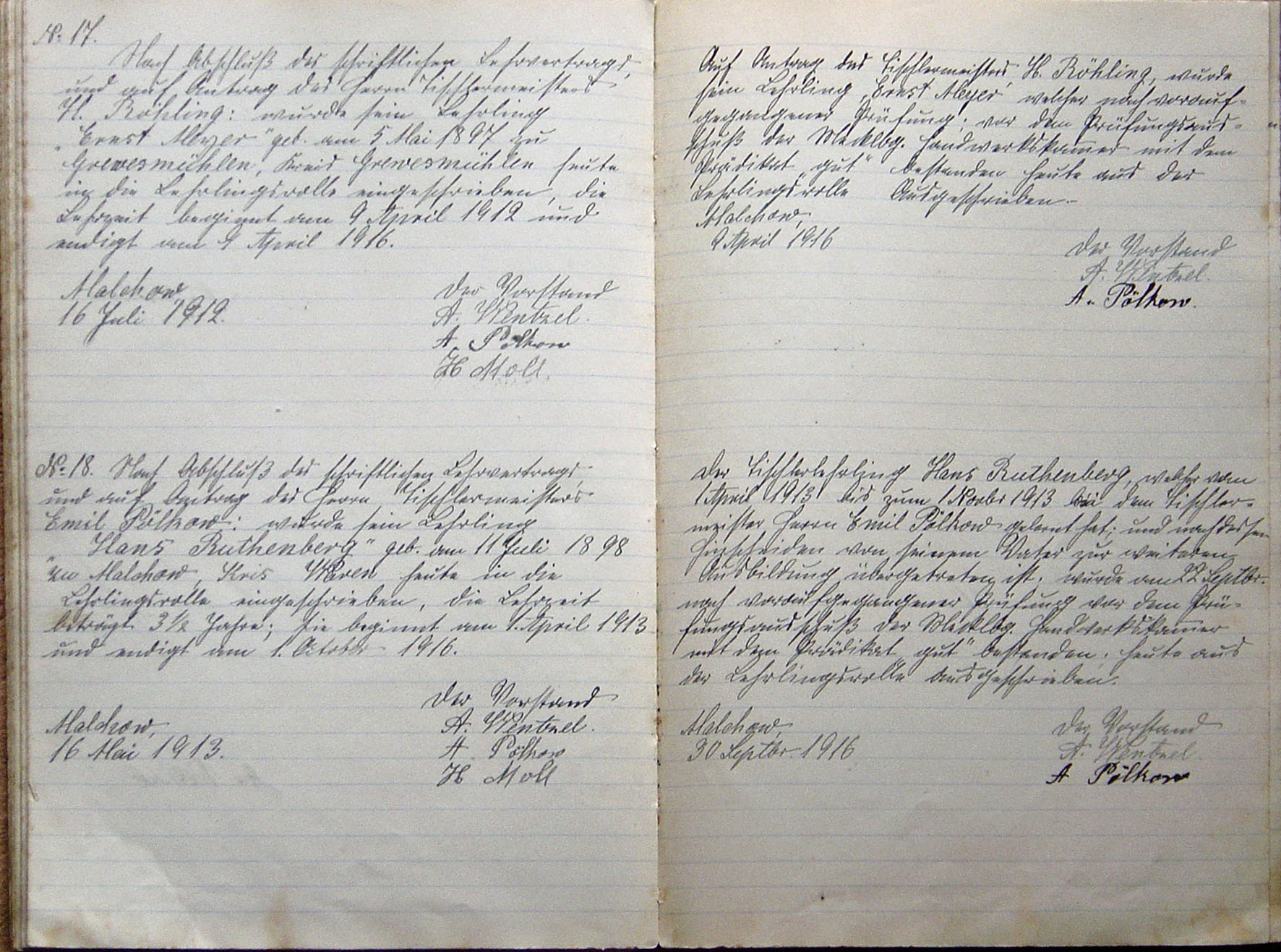 Nach Abschluß des schriftlichen Lehrvertrags und auf Antrag des Herrn Tischlermeisters Emil Pölkow: wurde sein Lehrling „Hans Ruthenberg“ geb. am 11. Juli 1898 zu Malchow, Kreis Waren heute in die Lehrlingsrolle eingeschrieben, die Lehrzeit beträgt 3 1/2 Jahre; sie beginnt am 1. April 1913 und endigt am 1.October 1916. Malchow, 16. Mai 1913 Der Vorstand |