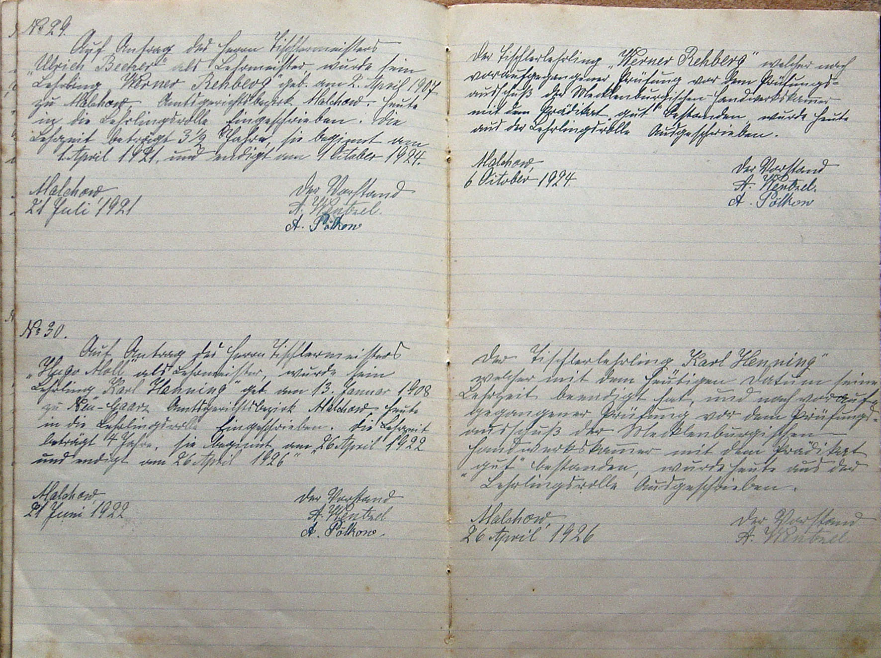 Auf Antrag des Herrn Tischlermeisters „Ullrich Becker“ als Lehrmeister wurde sein Lehrling Werner Rehberg geb. am 2. April 1907 zu Malchow, Amtsgerichtsbezirk Malchow , heute in die Lehrlingsrolle eingeschrieben. Die Lehrzeit beträgt 3 1/2 Jahre, sie beginnt am 1. April 1921 und endigt am 1. October 1924. Malchow, 21. Juli 1921 Der Vorstand |