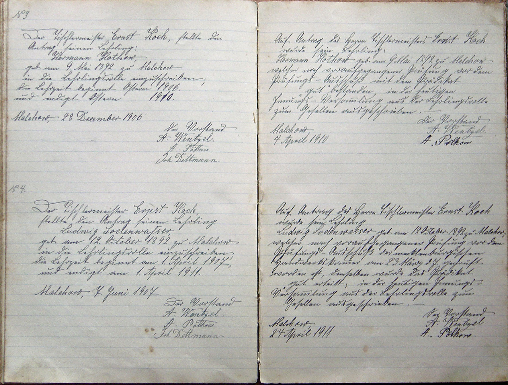 Der Tischlermeister Ernst Koch, stellt den Antrag seinen Lehrling Hermann Hothow, geb. 9. Mai 1892 zu Malchow in die Lehrlingsrolle einzuschreiben; die Lehrzeit beginnt Ostern 1906 und endigt Ostern 1910 Malchow, 28 Dezember 1906 Der Vorstand |