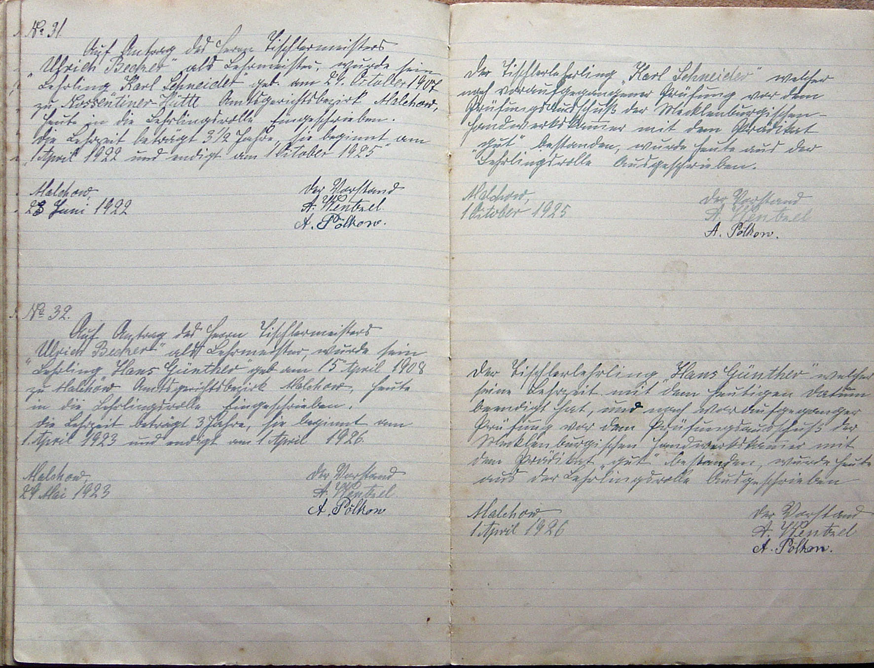 Auf Antrag des Herrn Tischlermeisters „Ullrich Becker“ als Lehrmeister wurde sein Lehrling „Karl Schneider“ geb. am 29. October 1907 zu Nossentiner Hütte Amtsgerichtsbezirk Malchow heute in die Lehrlingsrolle eingeschrieben. Die Lehrzeit beträgt 3 1/2 Jahre, sie beginnt am 1 April 1922 und endigt am 1 October 1925 Malchow, 23 Juni 1922 Der Vorstand |