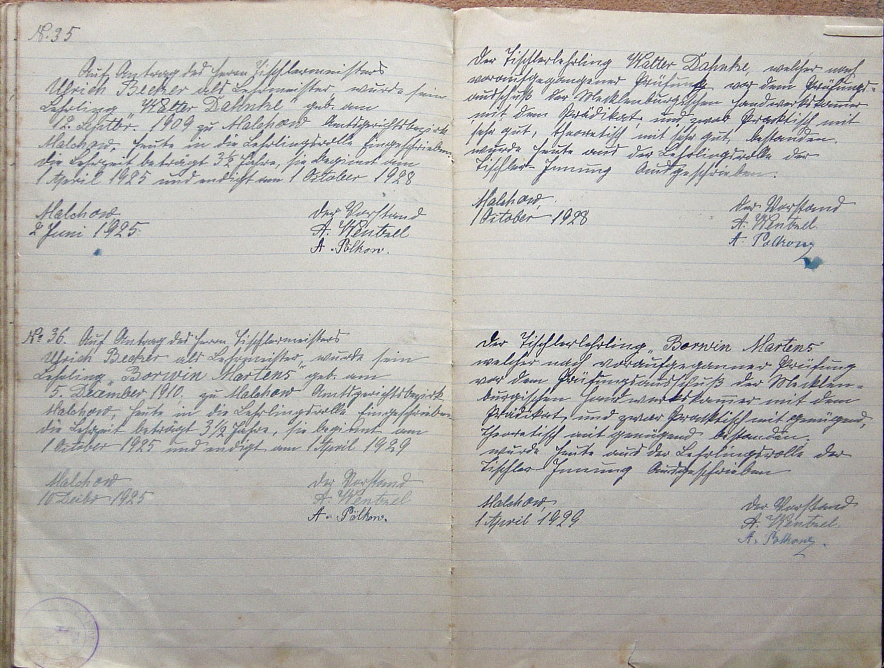 Auf Antrag des Herrn Tischlermeisters Ulrich Becker als Lehrmeister wurde sein Lehrling „Walter Dahnke“ geb. am 12. Septbr. 1909 zu Malchow Amtsgerichtsbezirk Malchow heute in die Lehrlingsrolle eingeschrieben. Die Lehrzeit beträgt 3 1/2 Jahre, sie beginnt am 1 April 1925 und endigt am 1 October 1928 Malchow 2 Juni 1925 Der Vorstand |