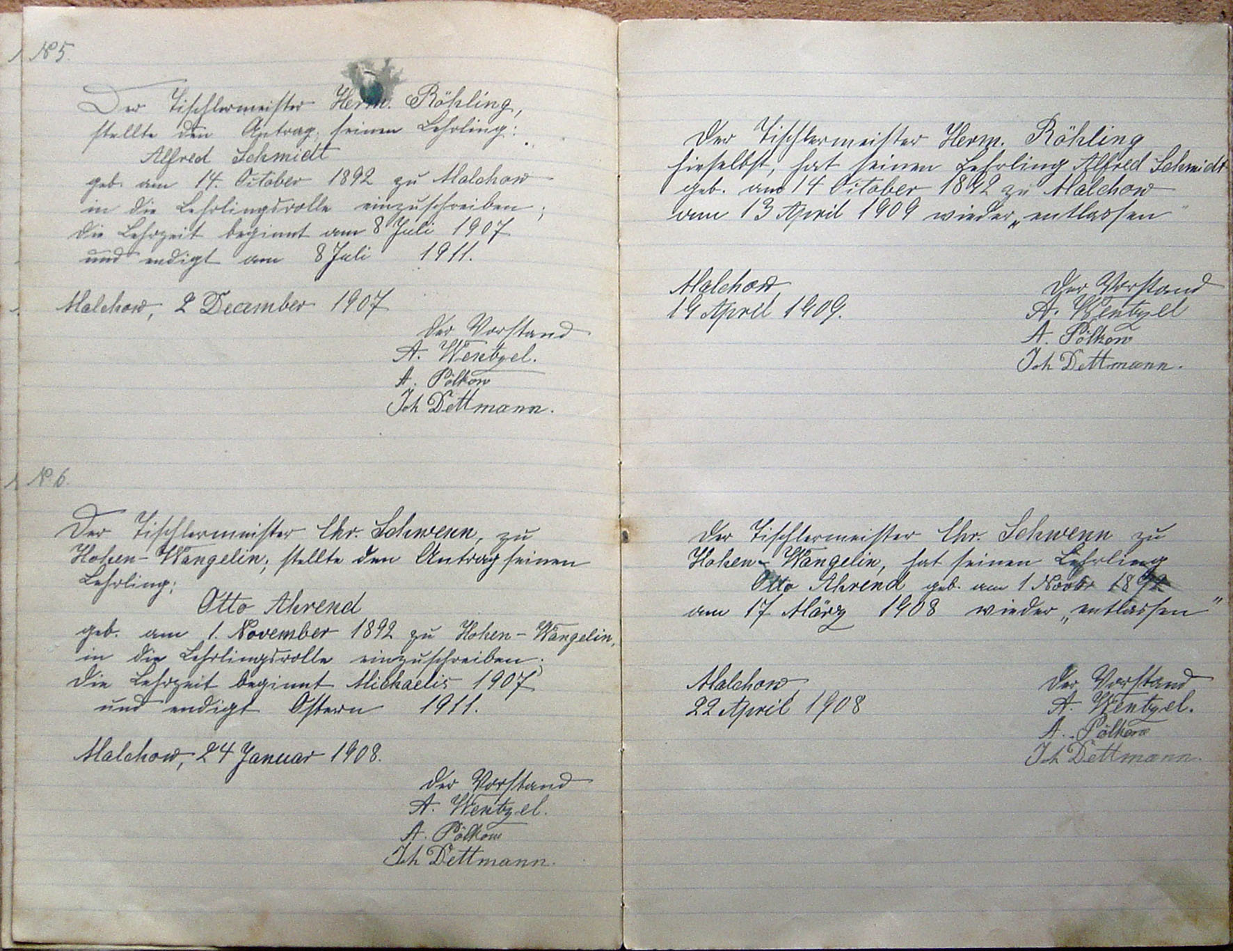 Der Tischlermeister Herm. Röhling stellt den Antrag, seienen Lehrling Alfred Schmidt geb. am 14 October 1892 zu Malchow in die Lehrlingsrolle einzuschreiben, die Lehrzeit beginnt am 8 Juli 1907 und endigt am 8 Juli 1911. Malchow, 2 December 1907 Der Vorstand |