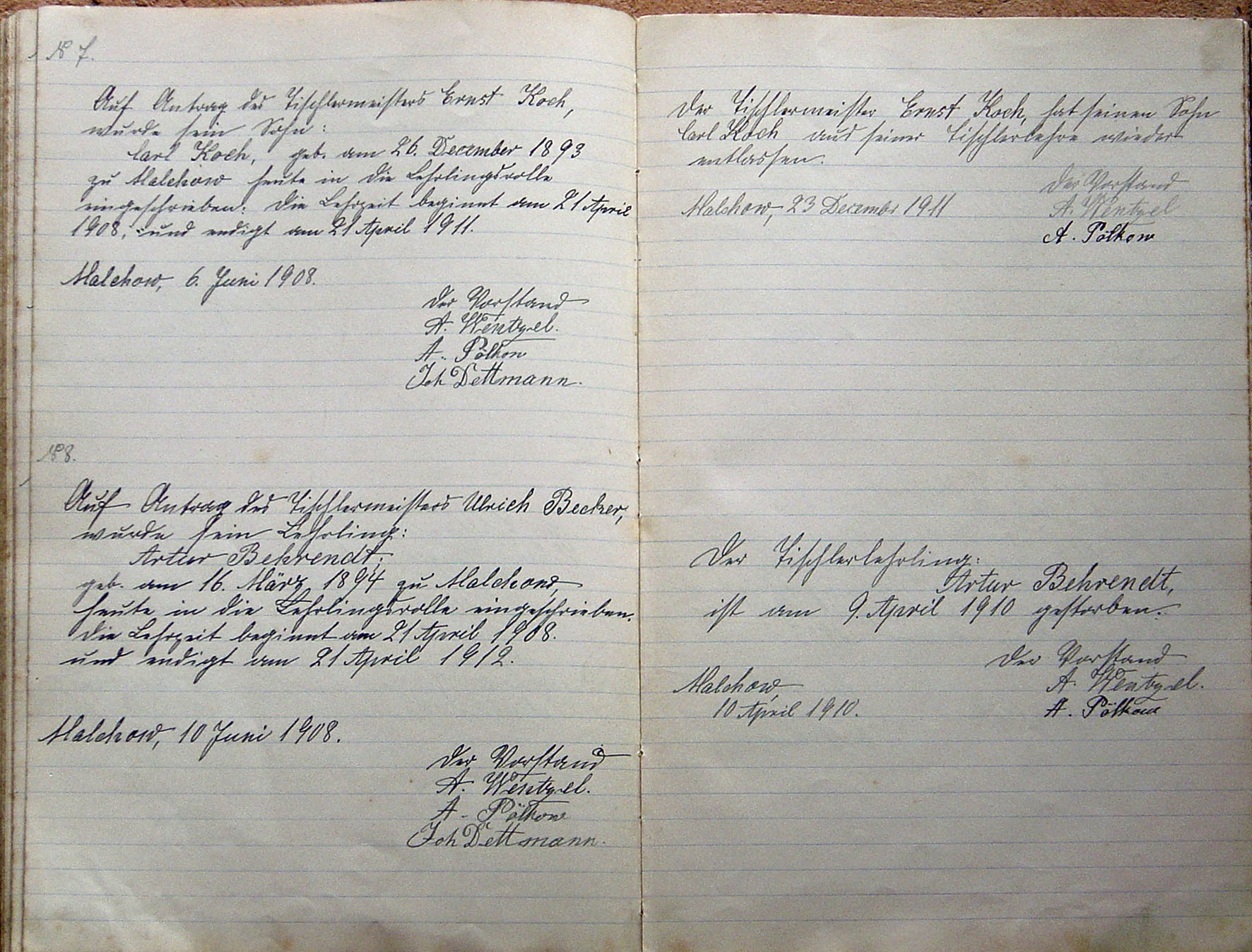 Auf Antrag des Tischlermeisters Ernst Koch wurde sein Sohn: Carl Koch, geb. am 26.December 1893 zu Malchow heute in die Lehrlingsrolle eingeschrieben. Die Lehrzeit beginnt am 21 April 1908, und endigt am 21 April 1911. Malchow, 6. Juni 1908 Der Vorstand |