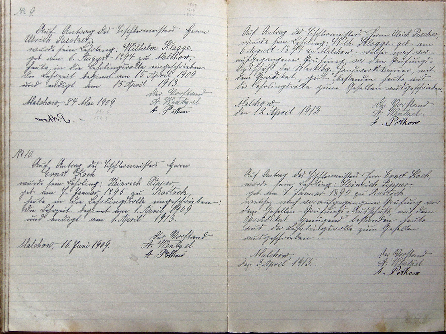 Auf Antrag des Tischlermeisters Herrn Ernst Koch wurde sein Lehrling: Heinrich Pipper, geb. am 7. Januar 1895 zu Rostock, heute in die Lehrlingsrolle eingeschrieben : Die Lehrzeit beginnt am 1. April 1909 und endigt am 1. April 1913. Malchow, 16.Juni 1909 Der Vorstand |