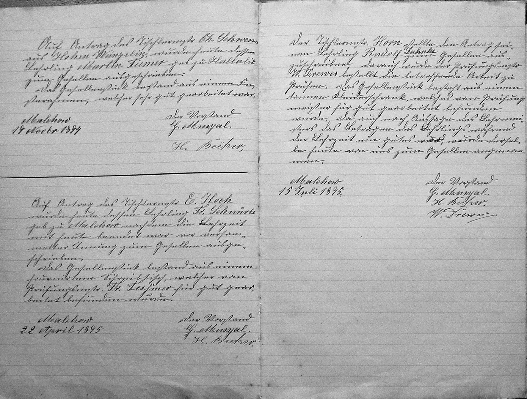 Auf Antrag des Tischlermstr E. Koch wurde heute dessen Lehrling Fr. Schnürle geb zu Malchow nachdem die Lehrzeit mit heute beendet war vor versammelter Innung zum Gesellen ausgeschrieben. Das Gesellenstück bestand aus einem fournierten Schreibtisch, welcher vom Prüfungsmstr. Fr. Teßmer für gut gearbeitet befunden wurde. Malchow 22 April 1895 Der Vorstand G. Musyal H. Becker |