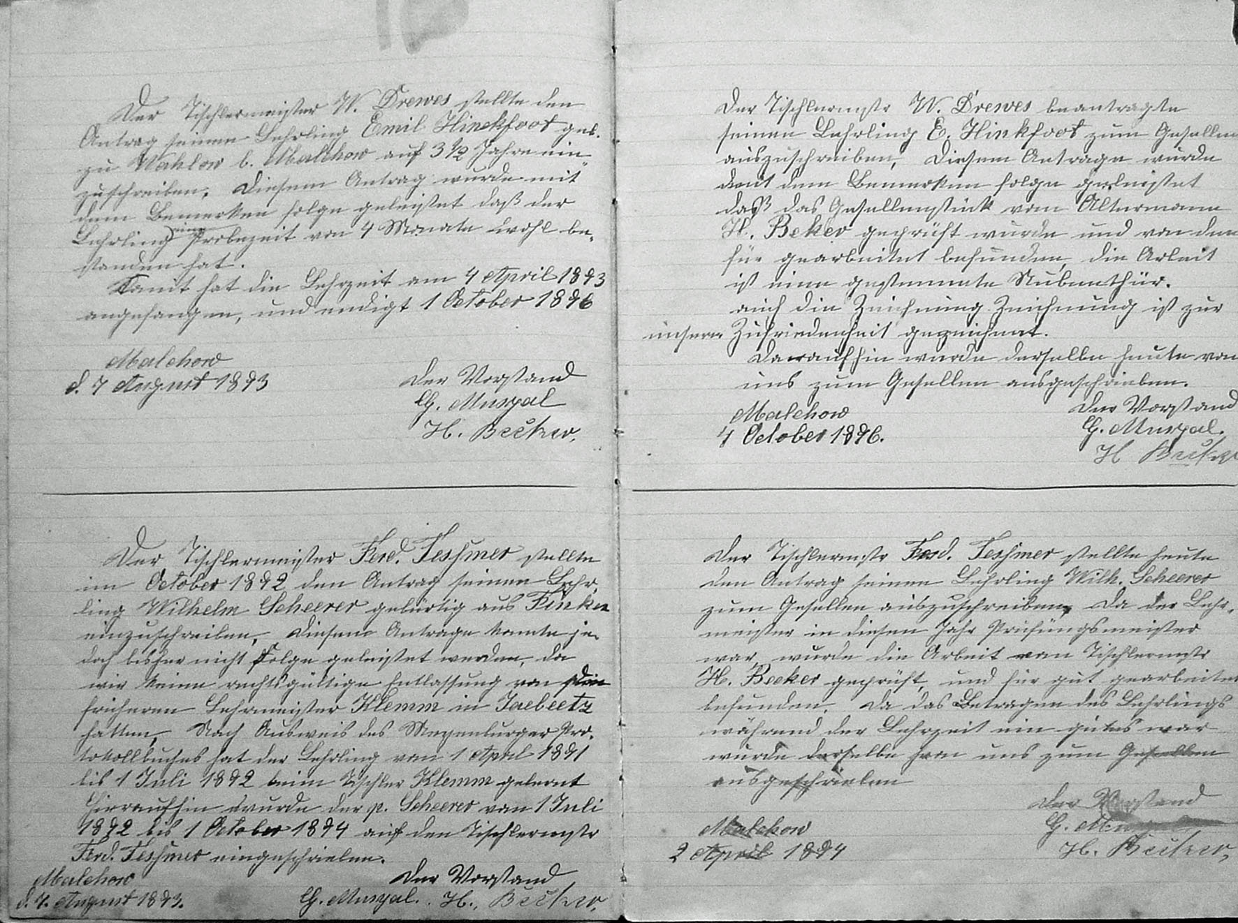 Der Tischlermstr W. Drewes beantragte seinen Lehrling E. Hinkfoot zum Gesellen auszuschreiben. Diesem Antrage wurde mit dem Bemerken folge geleistet daß das Gesellenstück vom Altermann H. Becker geprüft wurde und von dem für gearbeitet befunden, die Arbeit ist eine gestemmte Stubenthür. Auch die Zeichnung ist zur unserer Zufriedenheit gezeichnet. Daraufhin wurde derselbe heute von uns zum Gesellen ausgeschrieben. Malchow 4 October 1896 Der Vorstand G. Musyal H. Becker |