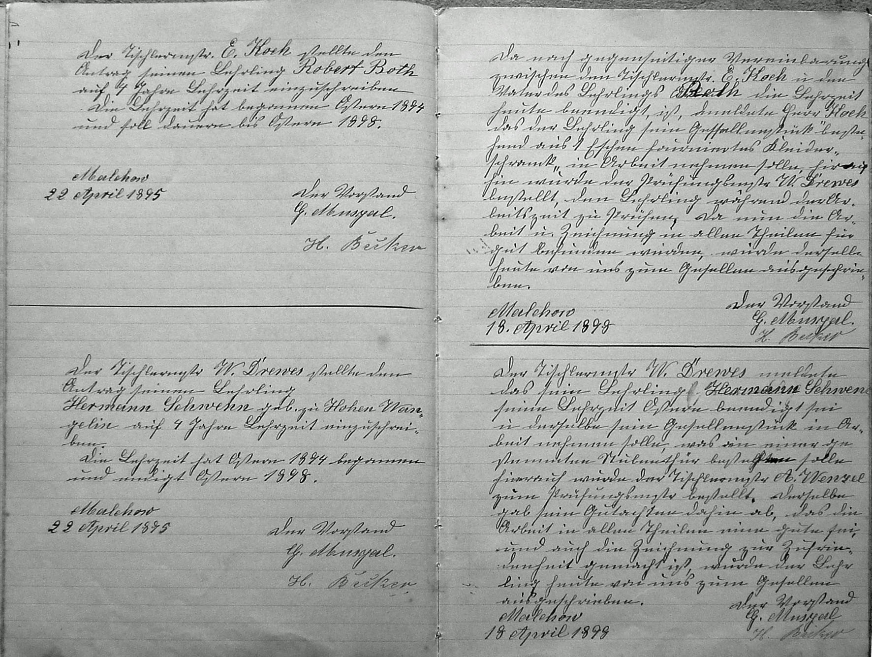 Der Tischlermeister E. Koch stellte den Antrag seinen Lehrling Robert Both auf 4 Jahre Lehrzeit einzuschreiben. Die Lehrzeit hat begonnen Ostern 1894 und soll dauern bis Ostern 1898, Malchow, d. 22 April 1895 der Vorstand G. Musyal H. Becker |