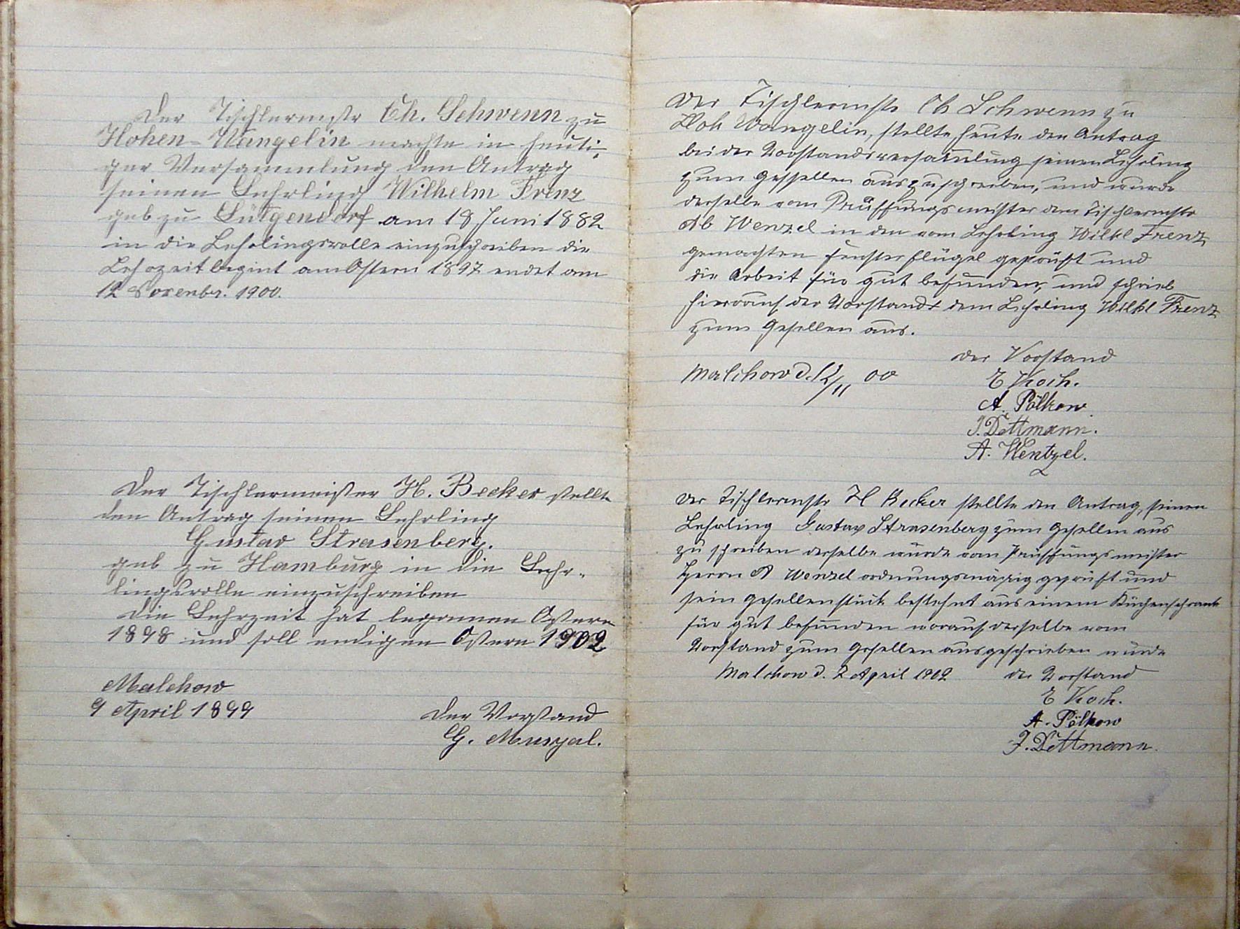 Der Tischlermeister H. Becker stellte den Antrag seinen Lehrling Gustav Strasenberg geb zu Hamburg in die Lehrlingsrolle einzuschreiben. Die Lehrzeit hat begonnen Ostern 1898 und soll endigen Ostern 1902 Malchow 9 April 1899 Der Vorstand G. Musyal |