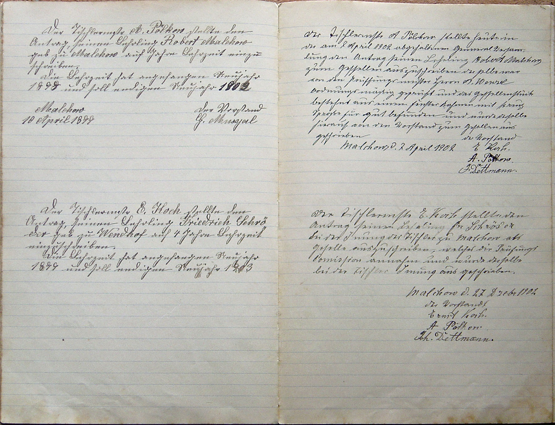 Der Tischlermstr A. Pölkow stellte heute in der am 7 April 1902 abgehaltenen General Versamlung den Antrag seinen Lehrling Robert Malchow zum Gesellen auszuschreiben. Derselbe war von dem Prüfungsmeister Herrn A. Wenzel ordnungsmäßig geprüft und das Gesellenstück bestehnt aus einem Fenster Rahmen mit Kreuz Sprosse für gut befunden und wurde derselbe hierauf von dem Vorstand zum Gesellen aus geschrieben Malchow d. 7 April 1902 Der Vorstand E. Koch A. Pölkow J. Dettmann |