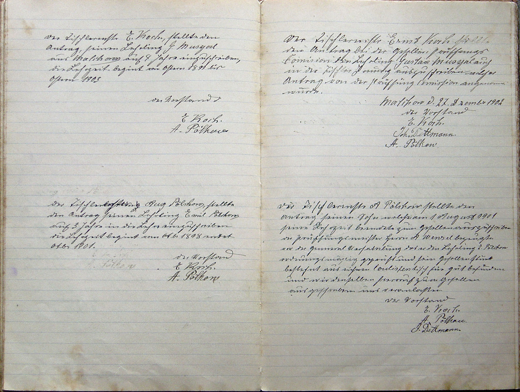 Der Tischlermstr E. Koch stellte den Antrag, seinen Lehrling G. Musyal aus Malchow auf 4 Jahre einzuschreiben, die Lehrzeit beginnt von Ostern 1899 bis Ostern 1903 Der Vorstand |