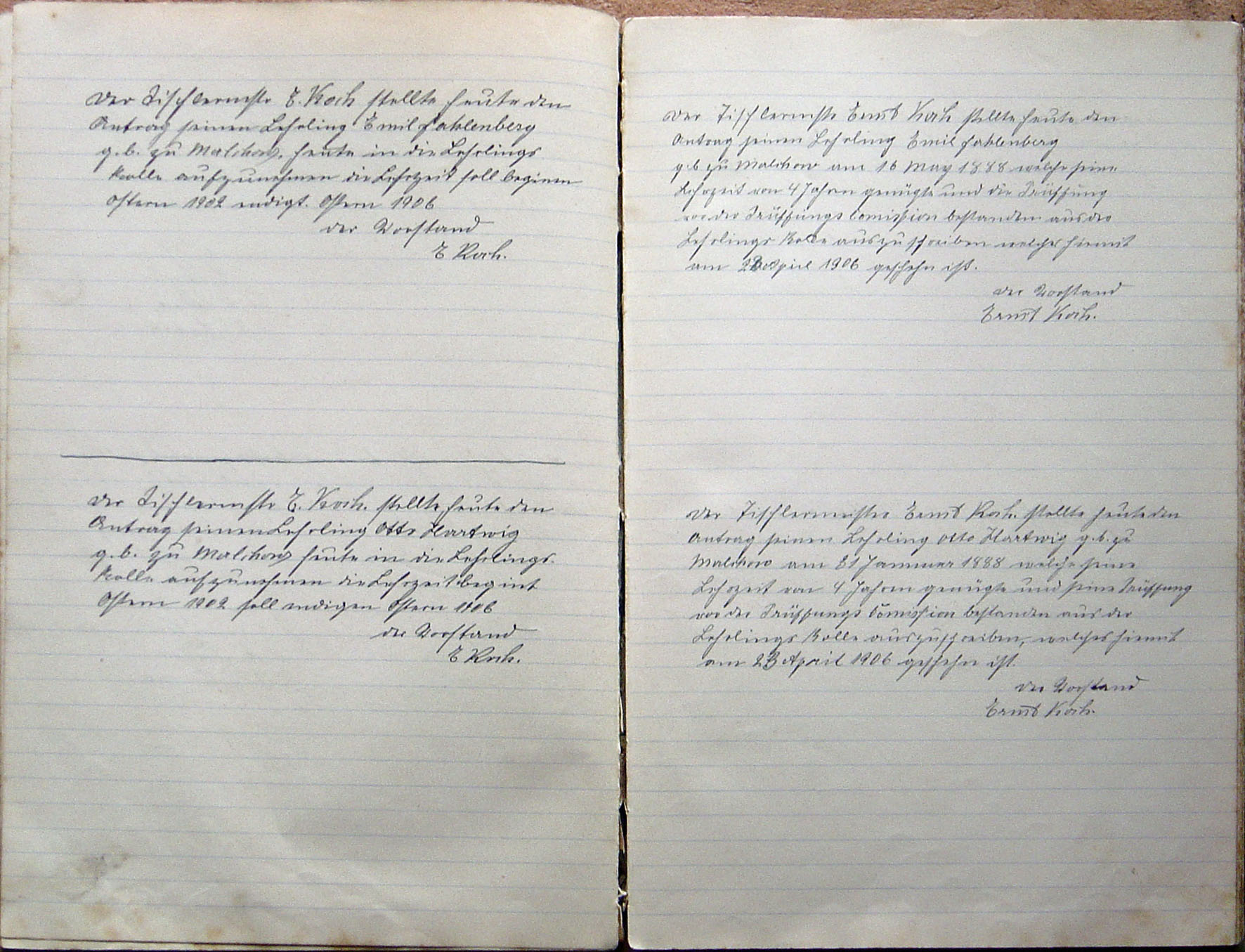 Der Tischlermstr Ernst Koch stellte heute den Antrag seinen Lehrling Emil Fahlenberg geb zu Malchow am 16 May 1888 welcher seine Lehrzeit von 4 Jahren genügte und die Prüfung vor der Prüfungs Comission bestanden aus der Lehrlings Rolle auszuschreiben welches hiemit am 23 April 1906 geschehen ist. Der Vorstand |