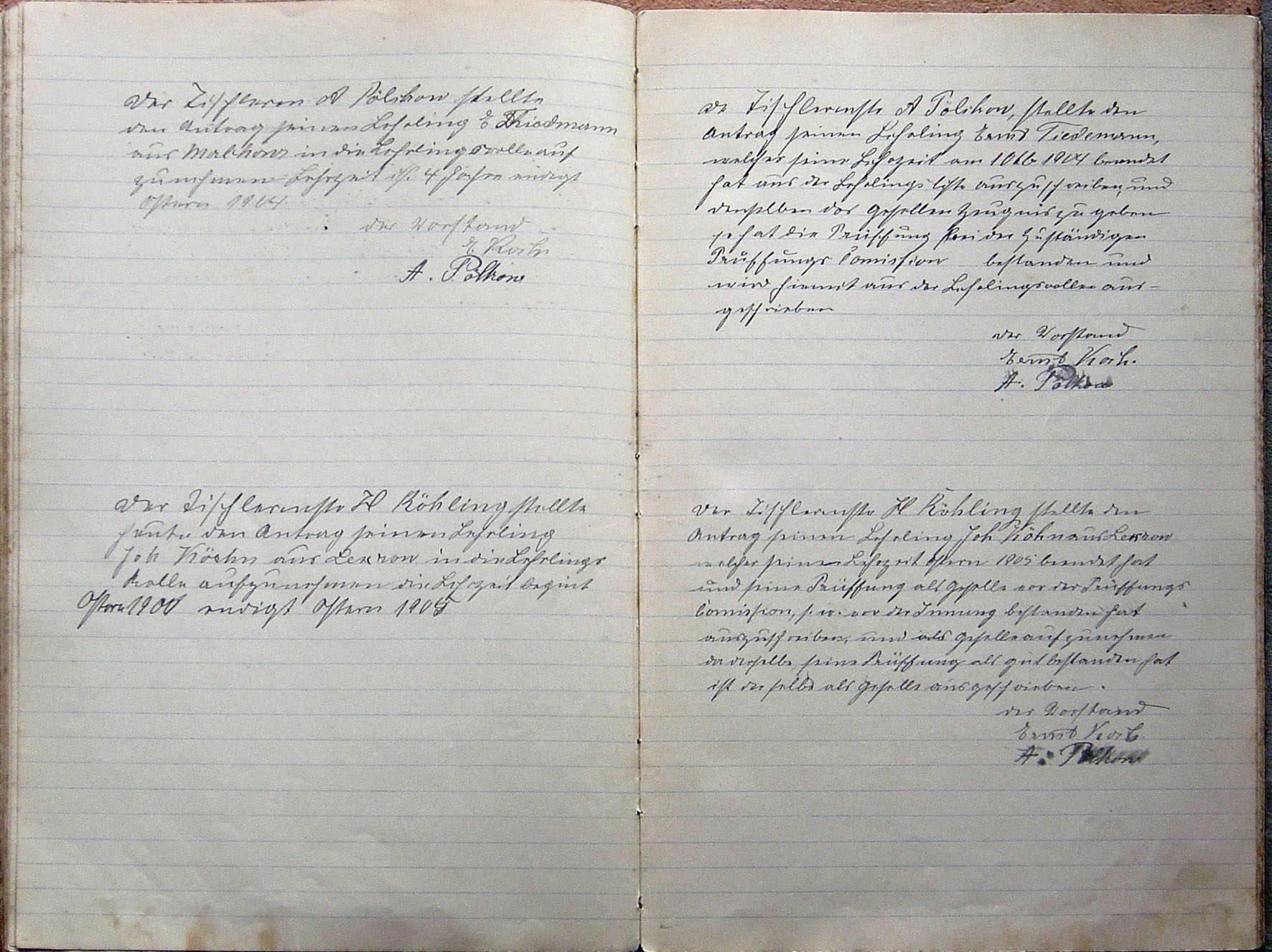 Der Tischlerm A. Pölkow stellte den Antrag seinen Lehrling E. Thiedemann aus Malchow in die Lehrlingsrolle auf zunehmen. Lehrzeit ist 4 Jahre endigt Ostern 1904 Der Vorstand |