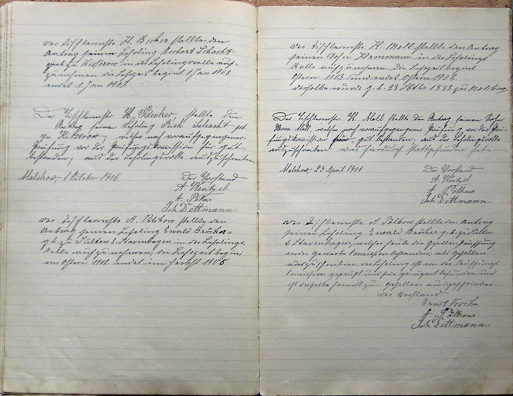 Der Tischlermstr H. Moll stellte den Antrag, seinen Sohn Herm. Moll, welcher nach voraufgegangener Prüfung vor der Prüfungskommission für gut bestanden, aus der Lehrlingsrolle auszuschreiben was hierdurch stattgefunden hat. Malchow,23 April 1906 Der Vorstand |